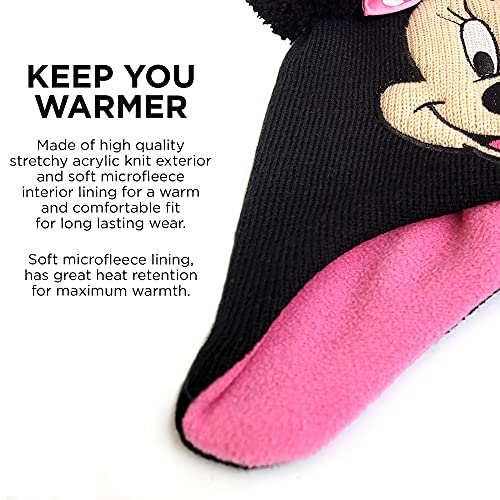 - PREMIUM QUALITY: Hat is made of durable acrylic knit exterior and a soft micro-fleece inside lining for cozy comfort and warmth. Hat features solid knit pattern with hosiery knit Minnie imagery design, pink satin polka dot bow and black jumbo yarn pom ears. Coordinating mittens complete this stylish look.