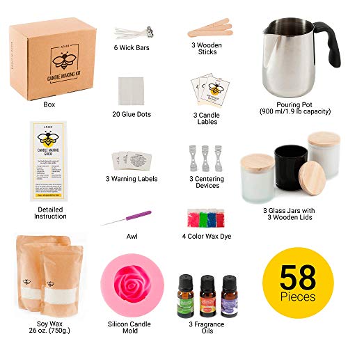 - CANDLE MAKING STARTER KIT INCLUDES: Big Pouring Pot (900 ml/1.9 lb capacity), 3 Fragrance Oils, 4 Color Wax Dyes, 26 oz. (750g.) of Soy Wax, 3 Glass Jars with Wooden Lids, 6 Wick Bars, 3 Warning Labels, 3 Candle Labels, 20 Glue Dots, 3 Centering Devices, 3 Wooden Sticks, Awl, Silicone Candle Mold, Detailed Instructions, Craft Box