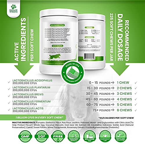 - Maintaining the Good Bacteria in Your Dog's Gut is Vital to Their Health, Our Soft Chews Make That Easy - Every delicious chew contains the perfect balance of five powerful probiotics and one prebiotic known to be most effective for dogs and puppies. Using these daily can help maintain a healthy GI tract, support regularity, help alleviate diarrhea, gas, and bloating, as well as aid in recovery from antibiotics