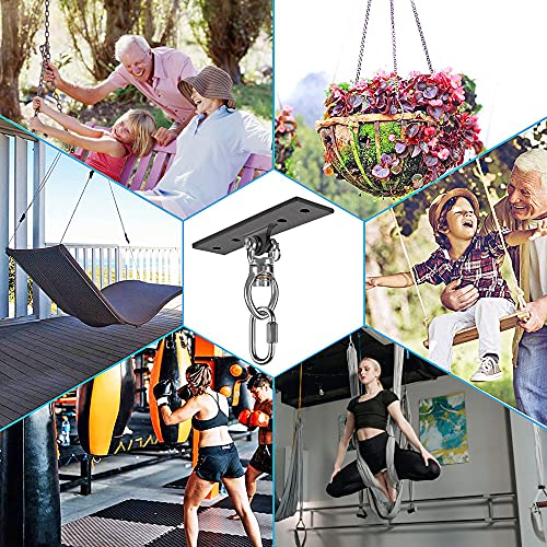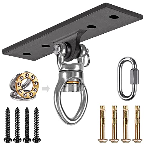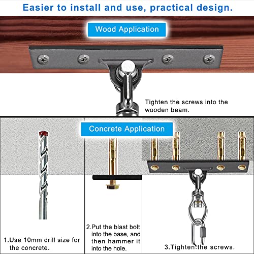 - EASY TO INSTALL: Include 4 expansion bolts and 4 wood screws. There are 4 holes in the base of the swing hanger, and use screws through this hole to fix it on the concrete ceiling or wooden beam. The swing ring with carabiner, even if your chain, rope or connecting buckle is closed, it can be connected. So it can be easily connected to items such as the hammock, swing chair or sandbag that you need to hang.