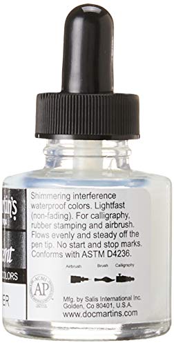 Details: Dr. Ph. Martin's iridescent calligraphy colors are shimmering, highly reflective colors that are lightfast, waterproof, archival, and permanent. Made from the finest ground pigments, the unmatched color intensity of dr. Ph. Martin's iridescent calligraphy colors gives you the ability to cover dark surfaces with a dynamic range of metallic color. Great for Use on paper, wood, board, metal, and some plastics. Dr. Ph. Martin's iridescent calligraphy colors dries smooth and even every time. No start and stop marks. Great for Use with pens (both calligraphy and dip pens), airbrushes, and brushes. Designed specially for calligraphy, to accent watercolor work, or anywhere where you need to add a magical shine and shimmer that only pigment-based iridescent color can provide. Available in 24 colors.