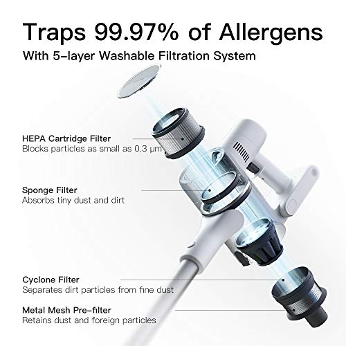 - 5 REFINED FILTRATION TECHNOLOGIES: The 5-stage filtration system captures 99.97% of fine dust and particles as small as 0.3 microns to release clean and refreshing air.