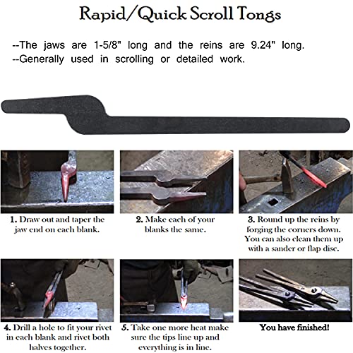 Details: It is essential to own this rapid tongs bundle that contains five types of tongs in almost every shop. ONLY with little work (see User's Guide below for full instructions) can you up and run with five pairs of tongs! This bundle includes: 1 Set Rapid Bolt Tongs 1 Set Rapid Flat Jaw Tongs 1 Set Rapid Slot Jaw Tongs 1 Set Rapid V-Bit Tongs 1 Set Rapid Scroll Tongs Features: - Rapid Bolt Tongs: have an open jaw which makes them ideal for grabbing metal with a bulky end that would get in the way with other styles of tongs. The jaws are 3" long x 1-3/4" wide and the reins are 13-1/4" long. - Rapid Flat Jaw Tongs: are the most popular and versatile tong available from Ken's Custom Iron. They are great for almost any project and can be shaped into box jaw, wolf jaw, or v-bit tongs to hold various sizes of metal. The jaws are 1-1/2" long x 1" wide and the reins are 11-1/2" long. - Rapid Slot Jaw Tongs: the addition of the slot in the jaw of these tongs allows you to grab round, square, or flat iron with the same pair of tongs. The jaws are 1-1/2" long x 1" wide and the reins are 11-1/2" long. - Rapid V-Bit Tongs: These tongs are made to fit multiple sizes and shapes of material. The "v" gives you a better grip on the material. These tongs are made from 5/16" thick mild steel. The jaws are 2-1/2" long x 1" wide and the reins are 12" long. - Rapid Scroll Tongs: are smaller with a tapered jaw that are generally used in scrolling or detail work. Their size also makes them versatile for many other applications. The jaws are 1-5/8" long and the reins are 6-3/8" long. It will take a bit of time. You have to drill or punch. Heat and hit them to get it right. But it's not difficult.