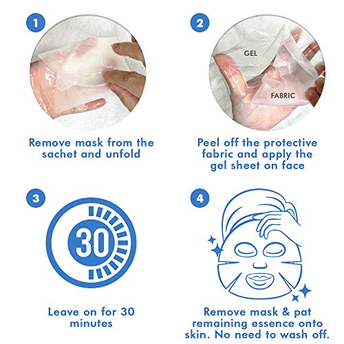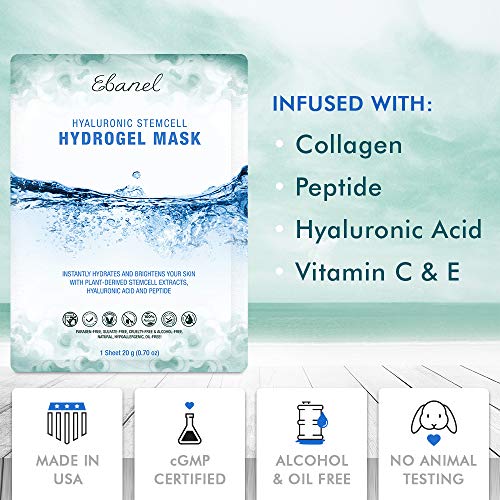 Details: Ebanel Hydrogel Mask HOLDS 50% MORE ESSENCE THAN A STANDARD PAPER FACE MASK - This collagen mask uses hydrogel material that holds 99% of liquid due to its molecular capacity of holding 500 times of its size; INSTANT HYDRATING, BRIGHTENING & FIRMING FACIAL MASK - Infused with purified Hyaluronic Acid, Collagen, Peptide, Ascorbic Acid, Aloe Vera, Stem Cell Extracts, this hydrogel hydrating face mask leaves skin feeling smooth and supple; PENETRATES DEEPER WITH HIGHEST LEVEL OF ABSORPTION OF ACTIVE INGREDIENTS - This Hydrogel sheet mask prevents the instant oxidation and evaporation of active ingredients. It steadily liquefies into moisture that helps penetrate the skin barrier for better transdermal delivery; CALMING & REFRESHING, STICK TO SKIN - The gel texture of this moisturizing face mask tends to have a cooling, soothing feel. This hydrogel mask shrinks as the skin absorbs hydration, resulting in less slipping and sliding around