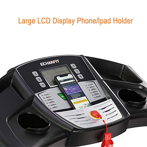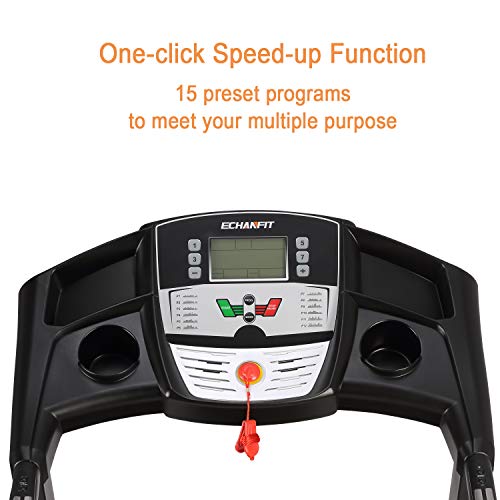 - ECHANFIT treadmill features a large LCD console and15 pre-set programs which allow you to track your workout in real-time with statistics monitoring your speed, time, calories, distance and heart-rate.