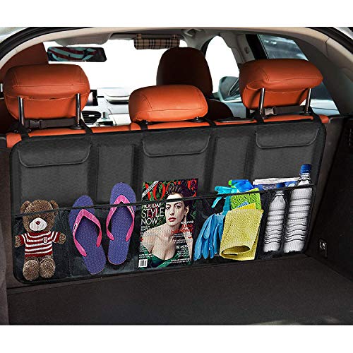 Details: High Capacity Car Storage Organizer Fully open size: 34 x 18-inches, made of oxford cloth and light weight nylon mesh. 2 small inserted pockets: store your frequently-used items in the car, such as cleaning cloth, detergent, etc. 2 medium-sized pockets with lids: store small items which are easy to lose, such as small maintenance tools, small accessories, etc. 4 mesh pockets: expand extra capacity to store any other items, such as drinks and snacks, outdoor travel equipment, etc. Designed to Security middle strap: fix on the middle headrest of the backseat to avoid sinking in the middle and strengthen bearing capacity. moderately deep pockets: easy to put all the items into them but never worry that your stuff will automatically fall off on the road. hook & loop tapes: equipped around the backside of the whole storage bag to fit the backseat closely to prevent violent shaking. Durable in Use made from 600d oxford fabric, abrasion-resistant and dirt-resistant, washable and easy to clean for long-time use. Easy to Install simply fasten the adjustable strap with heavy duty buckles through the headrest post and attach the hook & loop tapes to the seat back to finish installation in seconds.