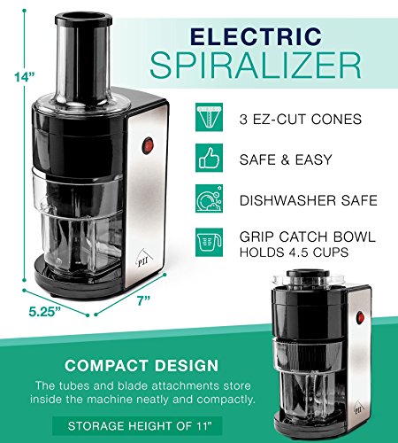 Details: PII's Gourmet Electric Spiralizer allows you to easily create your favorite healthy dishes using three different blades that allow for variety and versatility in your cooking like never before. Blade Sizes: - Noodle (Fettuccini Size)- Thin (Spaghetti Size)- Wide Ribbon Cut Use this spiralizer to cut & spiralize vegetables such as zucchini, potatoes, carrots, and more to create unique and flavorful dishes that are as beautiful to look at as they are tasty! About This Product: Electronic Spiralizer Easy To Use (Not Hand Cranked) Locking Mechanism For Safety Easily & Safely Switch And Replace Blades Large, Transparent Catching Container Stainless Steel Base & Blades Compact Design For Easy Storing 1.1 Liter Capacity Bowl - Largest on Amazon Easy Grip Bowl With Indented Handle Includes Manual Create Healthy & Delicious Meals Create Zoodles For A Healthy Pasta Alternative Dishwasher Safe This top quality electric spiralizer makes cooking a breeze. Use it to create fresh or marinated salads, curly fries, courgetti, pappardelle and other raw-pasta favorites. The colorful ribbons will satisfy picky eaters who will be impressed with the pasta like appearance and texture of healthy vegetables like carrots, squash, potatoes and more. How To Use PII's Electric Spiralizer: 1. Cut the top or bottom of the vegetable to make it flat.2. Securely attach the vegetable onto the pusher which is marked with an x.3. Feed the pusher and vegetable into the feeder tube onto the blade.4. Turn the power on and continue to steadily feed the secured vegetable through the feeder, Voila! Perfect results in a flash. This kitchen staple makes the perfect gift for just about anyone! Impress the favorite cook in your life! It also makes the perfect gift for a host or hostess and is an especially wonderful housewarming gift! Pick yours up today and make cooking fun again!