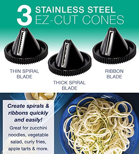 - NUTRITIOUS MEALS THAT LOOK GREAT: The cone shaped blade attachments come in 3 sizes for different cutting styles. Choose between fine spaghetti, fettuccini, or wide ribbon noodle thickness.