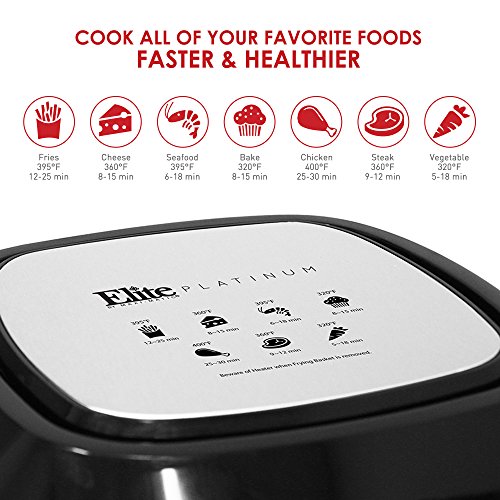 Details: " The easy, healthy way to fry Health-conscious eating doesn't have to mean giving up all of your favorite crispy delights like French fries, chicken and doughnuts. The Elite Platinum Air Fryer lets you indulge your cravings without the guilt. Its high-powered convection fan rapidly circulates hot air around foods in the cooking basket, producing crispy, delicious foods with just a fraction of the oil of traditional frying methods. There is no guesswork involved with these 6 Quick Menu functions: Bake, Meat, Fish, Cheese, Veggies, and Fries and adjustable temperatures from 149°F to 400°F. Cleaner, safer cooking made easy The Elite Platinum Air Fryer requires little to no oil so your days of painful hot-oil splatters on your hands and arms are over. Advanced touch screen technology includes a 60-minute timer with automatic shut-off, and a cool-touch handle lets you safely remove the pan after cooking. Fry basket boasts a food-safe non-stick coating, making clean-up quick and easy. This compact fryer takes up minimal counter space, making it perfect for apartments and dorms. Its sleek, stylish appearance ensures that it would be a much appreciated housewarming or wedding gift. Quality you can count on Our 1400-watt digital air fryer is ETL approved for your peace of mind. Additionally, every Elite Platinum Air Fryer is covered by our 1 year Limited Warranty against manufacturer defects. In the unlikely event that it ceases to perform as promised under normal use, contact us for a replacement. Get the taste you love, without the guilt. Add the Elite Platinum Electric Digital Air Fryer to your cart today. "