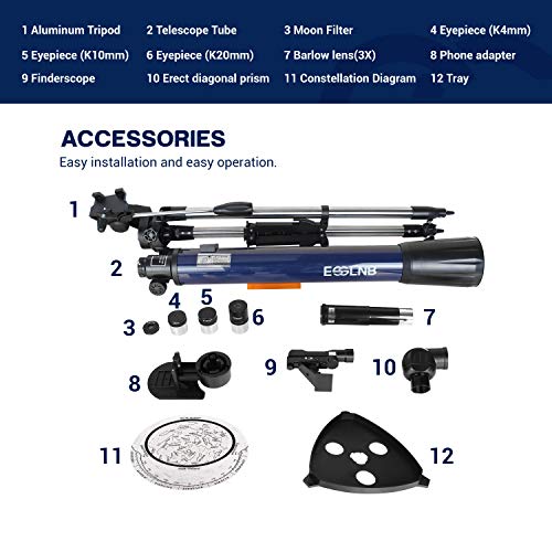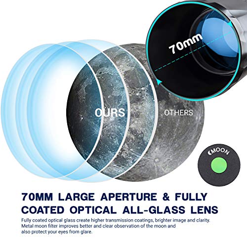 - This adult telescope with 70mm multi-fully coated optical glass enhances image brightness and clarity.The latest generation of three 1.25” interchangeable Kellners eyepiece(K4/K10/K20) with 3X Barlow lens increase three times magnification,making refracting telescope up to 525X. .It is a perfect telescope for kids,adults or those astronomy beginners as birthday gifts.