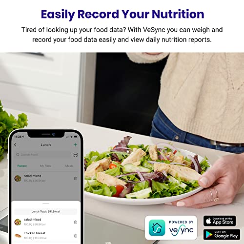 - Smart Bluetooth: works with Bluetooth on iOS and Android. You can easily operate the scale through smart VeSync app to Tare, convert units and adjust display time