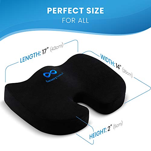 Details: CAUTION: Non-slip rubber bottom may stain light colored leather/vinyl. Before use, wash cover in soap and hot water. Once the cover is dry, test for color fastness with a towel and hot water.Treat your back with a pure memory foam seat cushion. Recommended by orthopedists and doctors to alleviate pressure in strategic areas like the tailbone, coccyx, back, spine hips, & sciatic nerves. Also provides added comfort for women during pregnancy. Versatile design is ideal for most commonly sized office chairs, airplane seats, car seats, stadium seats, benches, etc. Please be sure to check our product dimensions (17 x 13.2 x 2.4 inches) to ensure a proper fit.Optimal density for superior comfort and durability for anyone 100-300 pounds. Our removable soft cover is machine washable and slip resistant. If anything happens to your Everlasting Comfort Memory Foam Seat Cushion or you’re unsatisfied for any reason, no need to buy another. We will send you a free replacement or give you a full refund. We take personal pride in delivering ultimate customer satisfaction. We are here to serve you.