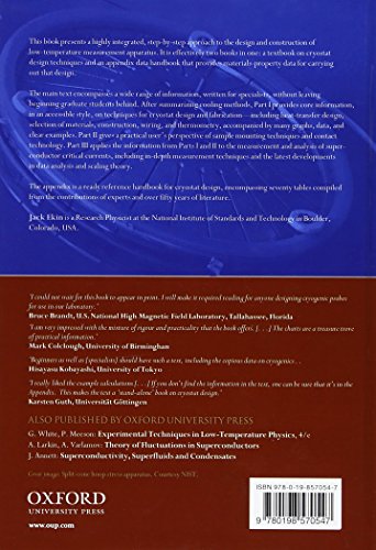 Details: Product Description This book presents a highly integrated, step-by-step approach to the design and construction of low-temperature measurement apparatus. It is effectively two books in one: A textbook on cryostat design techniques and an appendix data handbook that provides materials-property data for carrying out that design. The main text encompasses a wide range of information, written for specialists, without leaving beginning students behind. After summarizing cooling methods, Part I provides core information in an accessible style on techniques for cryostat design and fabrication - including heat-transfer design, selection of materials, construction, wiring, and thermometry, accompanied by many graphs, data, and clear examples. Part II gives a practical user's perspective of sample mounting techniques and contact technology. Part III applies the information from Parts I and II to the measurement and analysis of superconductor critical currents, including in-depth measurement techniques and the latest developments in data analysis and scaling theory. The appendix is a ready reference handbook for cryostat design, encompassing seventy tables compiled from the contributions of experts and over fifty years of literature. Review "At last a new book, not a collection of technical papers, has been published on the techniques of low-tempurature measurements. ... I highly recommend Ekin's book. It is informative and well written, for beginners who are starting research at low temperatures and for veterans who will benefit from the author's experience."-- Physics Today "I could not wait for this book to appear in print. I will make it required reading for anyone designing cryogenic probes for use in our laboratory."-- Bruce Brandt, U.S. National High Magnetic "I am very impressed with the mixture of rigour and practicality that the book offers. [...] The charts are a treasure trove of practical information."-- Mark Colclough, University of Birmingham "... an invaluable resource to interested scientists and engineers. "-- Adam Gromko, University of Colorado, Boulder About the Author Jack Ekin NIST Div. 818.03 325 Broadway St. Boulder, CO 80305, USA Jack Ekin is a Research Physicist at the National Institute of Standards and Technology in Boulder, where his contributions have spanned a wide range of topics in low-temperature physics, including studies of fundamental conduction processes in normal metals, electro-mechanical properties of both high- and low-Tc superconductors, and interface conduction in thin films and nanostructures. He completed a B.S. degree at the University of Michigan, conducted his early graduate work in physics at the University of Heidelberg as a Fulbright Scholar, and received M.S. and Ph.D. degrees from Cornell University. Currently, he also holds an appointment as Lecturer at the University of Colorado. He is a member of the Institute of Electrical and Electronics Engineers and a Fellow of the American Physical Society. He has published over 150 cryogenic research articles, textbook chapters, and patents, and has lectured and consulted internationally in the field of low-temperature measurements.