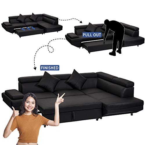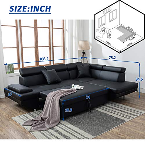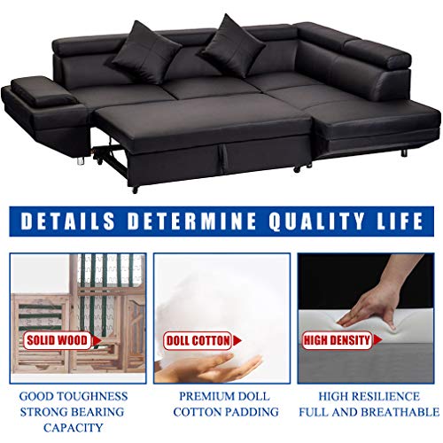 FDW Sofa Sectional Sofa Bed futon Sofa Bed Sofa for Living Room Couches and Sofas Sleeper Sofa PU Leather Sofa Set Corner Modern Queen 2 Piece Contemporary Upholstered,Black