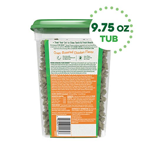 - This convenient tub contains 9.75 oz. of Feline Greenies Crunchy Dental Treats in Oven Roasted Chicken Flavor
