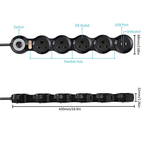 - đăUniversal Power Stripă4 USA standard outlets, 2 USB ports (5V, 2.2A) and a 9ft(2.7 meters) extension cord with switch indicator(Soft light). The USB port can charge more quickly smart electrical devices such as phones, iPods, and tablets.