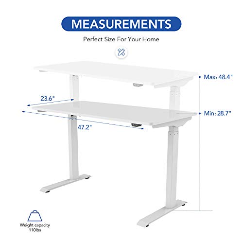 - ELECTRIC HEIGHT-ADJUSTABLE LIFT SYSTEM: A sturdy and stable design provides a superior ergonomic sit-stand office experience, featuring a height range of 28.7" to 48.4"; a maximum weight capacity of 110 lbs.; a speed of 1" per second; and low noise while running.