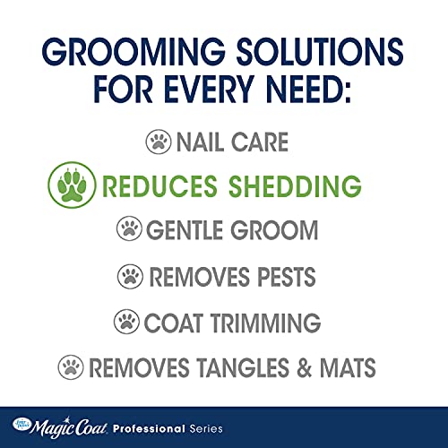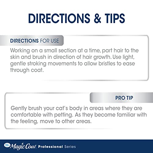 Details: The Magic Coat Professional Series features premium multi-purpose pet grooming tools for a salon-like experience right at home. Designed with thinner bristles for delicate cat skin, the Comfort-Grip Cat Slicker Brush gently lifts and captures excess hair while increasing shine for a lustrous coat. It features a curved head that glides over hard-to-reach areas and flexible bristles that remove loose hair while smoothing the coat. This cat shedding brush is designed with a sturdy ergonomic handle and a thumb grip, offering ultimate comfort and control while grooming your best friend. Made specifically for cats and kittens, this slicker brush is ideal for medium or long coats.