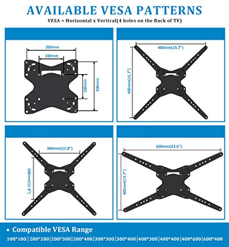 • UNIVERSAL DESIGN TV MOUNT: Our TV wall mount fit for most 32-70" TVs weighing up to 110lbs like Samsung, Philips, Panasonic, LG, Thomson, Sony, etc. TV bracket with compatible faceplate that fits VESA from 100x100mm to 600x400mm, Please check the VESA pattern, weight, size of your TV before purchasing.