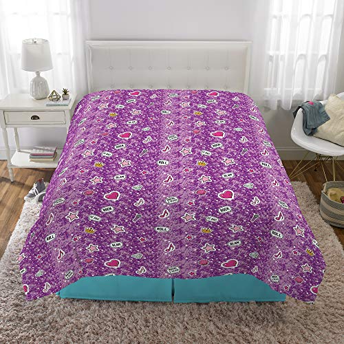- TWO DESIGNS IN ONE COMFORTER: The fun never stops with this reversible comforter. One side features adorable character imagery of Diva, Rocker, M. C. Swag, Queen Bee, Merbaby, and Fancy on a bright pink background. When it’s time for a new number, flip it over to reveal a fresh all-over glam print on a purple background.