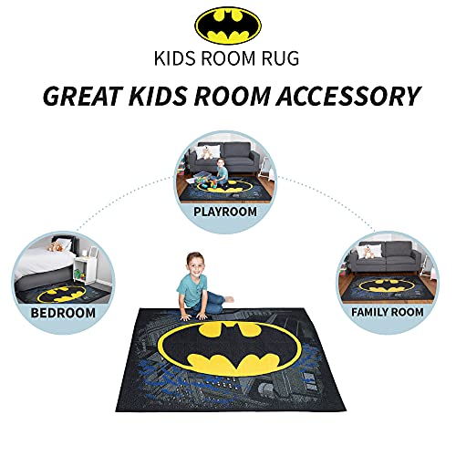 - BATMAN DESIGN: Calling all crime fighters! This high-quality Batman rug brings the popular Warner Bros. animation style to any space with its instantly recognizable black and yellow Bat Symbol. Featuring a bold "Bat View" pattern with a Gotham City backdrop, this soft and stylish rug is sure to be a hit with young Batman fans.