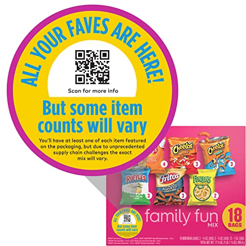 - Family Fun Mix 18 Pack includes Lay's Cheddar & Sour Cream Potato Chips, Cheetos Crunchy, Cheetos Puffs, Ruffles Sour Cream & Onion Potato Chips, Fritos Honey BBQ Flavor Twists, and Funyuns
