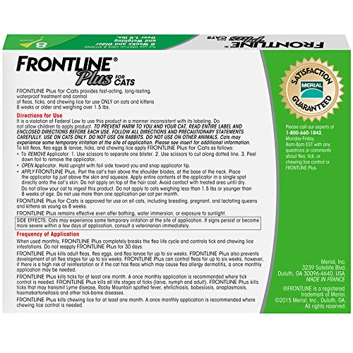 Details: Trusted by vets for over 20 years, waterproof, fast-acting FRONTLINE Plus kills fleas, flea eggs, lice, and ticks, including those that may transmit Lyme disease. Designed for use only with cats and kittens, this long-lasting treatment is made for cats eight weeks or older, weighing 1.5 pounds or more. Made with two active ingredients, fipronil and (S)-methoprene, this treatment stops infestations and prevents new ones. Applied on a single point on your pet, the treatment rapidly covers your cat's entire body and deposits in the sebaceous glands. These glands as a reservoir, continuously replenishing the treatment onto your pet, working even if your cat gets wet. One dose of FRONTLINE Plus lasts 30 days. If you are not satisfied with FRONTLINE Plus for any reason, please contact the Boehringer-Ingelheim Animal Health Customer Care Team at: 1-800-660-1842.