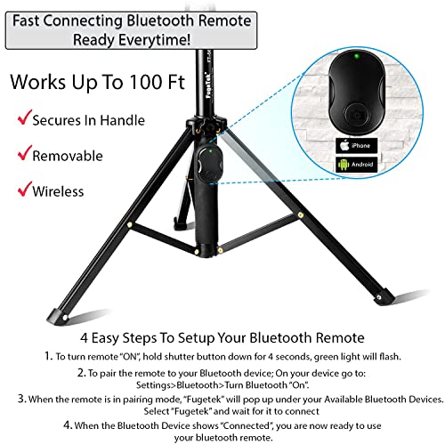 Details: You Asked For It, We Heard You! Our customers wanted a Selfie Stick and Tripod together. The FT-569 picks up where our Amazon's Choice FT-568 Selfie Stick leaves off. The Fugetek FT-569 Integrated, Portable, All In One Selfie Stick / Tripod is designed with FUN, FUNCTIONALITY and PERFORMANCE in mind. The highly adjustable and removable mount, guarantees you will have universal compatibility for your phone and other devices. Plus, a built in tripod base allows for more flexibility and variety of pictures. Why Our Professional Selfie Stick Surpasses The Competition... Products Features: * ALL-IN-ONE PROFESSIONAL SELFIE STICK & BUILT IN TRIPOD: No Need For A Separate Selfie Stick And Tripod. This fully adjustable all in one selfie stick enables a wide array of unique and spectacular photography options. * ULTRA EXTENDABLE AT 51", HARDLY TELL IT IS A SELFIE PICTURE! : Quick Flip Locks – No Twisting To Lock - Wobble Free Selfies - Toughest Material, Durable / Non-slip sure grip rubber handle. * FAST CONNECTING BLUETOOTH REMOTE: iPhone, Android, Digital Camera (Bluetooth may be incompatible with some cameras) - Compatible with iPhone iOS and Android 4.3 or newer (*iOS has no zoom feature. *Zoom works on limited Android devices, Bluetooth remote incompatible with Go Pro). Bluetooth Remote connects faster than the competition - Rechargeable Battery, 300 Hours Standby, 1 Hour Full Charge. * BUILT IN TRIPOD TO CAPTURE EVERY MOMENT: Extend The Feet On The Tripod And You Now Have A Standalone Selfie Stick. Equipped With Non- Skid Feet, For More Safety. Includes: 1 - Selfie Stick 1 - Bluetooth Remote 1 - Charging Cable 1 - Phone Mount 1 - Manual 1 - 1 year Warranty What are you waiting for? Try one out today. If you don't absolutely love it, send it back. You can always contact our friendly customer service staff in our Houston,Tx office.
