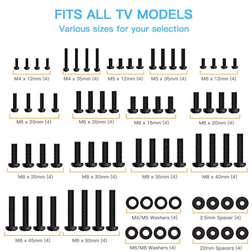 - Our TV hardware comes with everything you need to attach your TV to a wall mount or stand. The pack contains M4, M5, M6, and M8 TV screws, washers, and spacers for mounting most TVs up to 80 inches