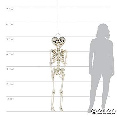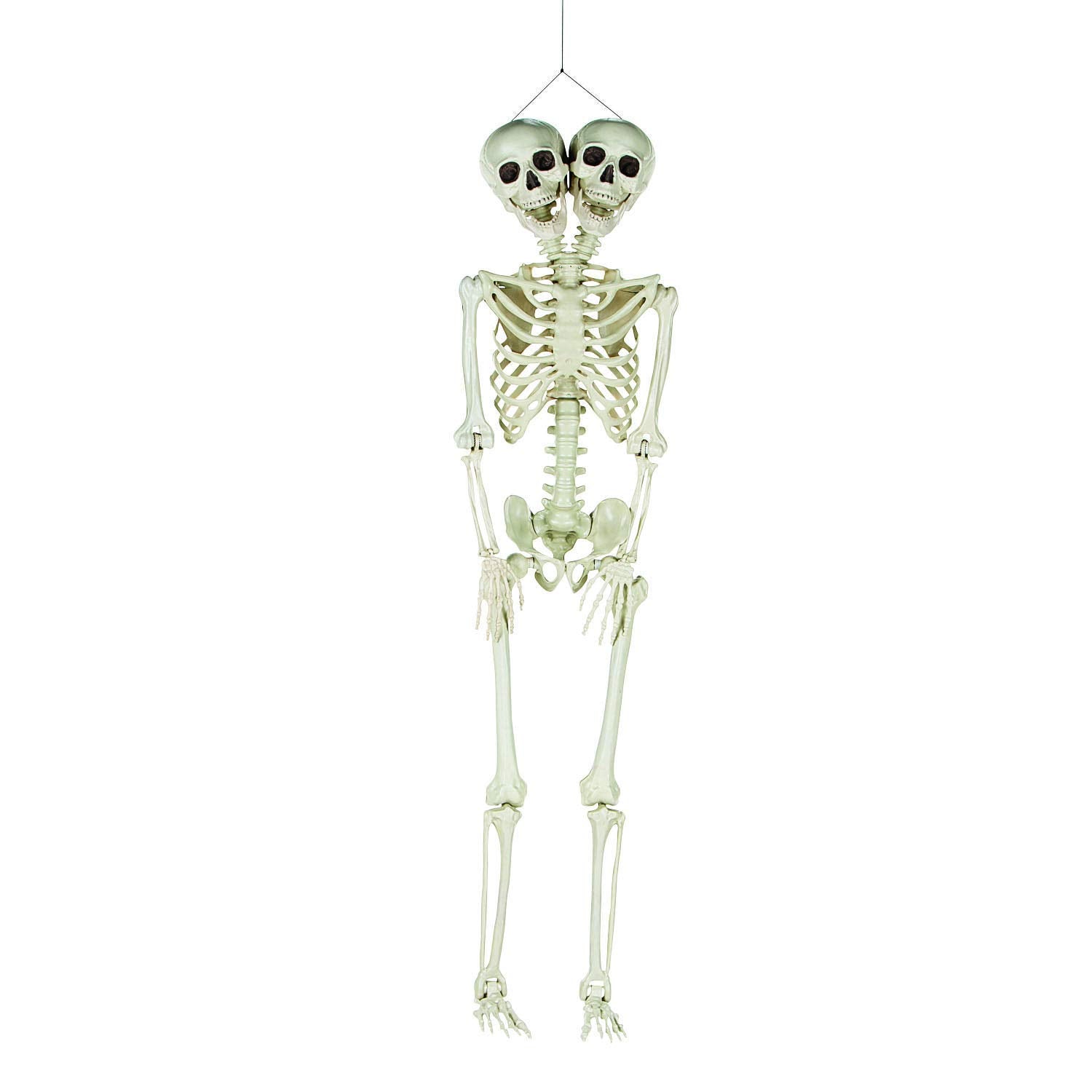 Details: This two-headed skeleton Halloween decoration can be posed in various positions for the ultimate scare! Dress it up to make a scary decoration or pose it casually on a chair on your front porch to make your trick-or-treaters do a double take! indoors or out, your Halloween party guests and passersby are sure to get a kick out of it. Includes string so you can turn it into hanging décor. Plastic. 60"