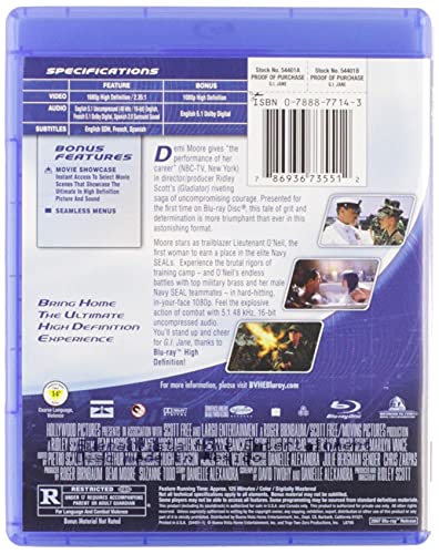 Details: Amazon.com It seemed like a pretty good career move, and for the most part it was. Demi Moore will never top any rational list of great actresses, but as her career stalled in the mid-1990s she had enough internal fire and external physicality to be just right for her title role in G.I. Jane. Her character's name isn't Jane--it's Jordan O'Neil--but the fact that she lacks a penis makes her an immediate standout in her elite training squad of Navy SEALs. She's been recruited as the first female SEAL trainee through a series of backroom political maneuvers, and must prove her military staying power against formidable odds--not the least of which is the abuse of a tyrannical master chief (Viggo Mortensen) who puts her through hell to improve her chances of success. Within the limitations of a glossy star vehicle, director Ridley Scott manages to incorporate the women-in-military issue with considerable impact, and Moore--along with her conspicuous breast enhancements and that memorable head-shaving scene--jumps into the role with everything she's got. Not a great movie by any means, but definitely a rousing crowd pleaser, and it's worth watching just to hear Demi shout the words "Suck my ----!!" (rhymes with "chick"). --Jeff Shannon Product Description Demi Moore gives "the performance of her career" (NBC-TV, New York) in director/producer Ridley Scott's (GLADIATOR) riveting saga of uncompromising courage. Presented for the first time on Blu-ray Disc, this tale of grit and determination is more triumphant than ever in this astonishing format. Moore stars as trailblazer Lieutenant O'Neil, the first woman to earn a place in the elite Navy SEALs. Experience the brutal rigors of training camp -- and O'Neil's endless battles with top military brass and her male Navy SEAL teammates -- in hard-hitting, in-your-face 1080p. Feel the explosive action of combat with 5.1 48 kHz, 24-bit uncompressed audio. You'll stand up and cheer for G.I. JANE, thanks to Blu-ray High Definition!