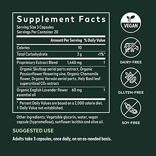 - Made with Passionflower, chamomile, Holy Basil (Tulsa), Lavender essential oil and fresh organic Skullcap from the Gaia Herbs farm, this herbal blend gives your nervous system the soothing support it deserves in stressful moments.