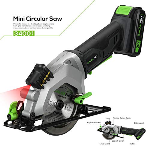 Details: Application The Compact Circular Saw is most commonly used to refer to a hand-held electric circular saw which is designed for cutting wood, PVC pipe and so on, but may be used for cutting other materials with different blades Soft Grip Handle&Convenience Ergonomic rubber handle improves comfort and enhances grip and control guide with just one hand at ease; With blade guard to protect the blade under no operation; Allen wrench for blade change easily; Dust extraction adapter keeps the cut line free of dust for improved visibility Moved Lower Guard The fixed guard and lower guard not only protect the blades for good maintenance to extend its service life but prevent you from being hurt by the sharp blade to assure you of a safe operation Accurate Cutting With both laser guide and rip guide for precision cutting. Great mini circular saw that wonderful for not-big jobs, working in tight spaces, or cutting outdoor that corded saw hard not reach Specifications: Voltage: 20V No load speed: 3400RPM Blade Size: 4-1/2” Max cutting depth: 1-11/16”(90°);1-1/8”(45°) Package Contents: ✿1* GALAX PRO 97630 Cordless Circular Saw; ✿1* 1.3Ah Li-ion Battery; ✿1* 24 Teeth TCT Saw Blade; ✿1* 60 Teeth HSS Saw Blade; ✿1* Charger; ✿1* Vacuum Adapter; ✿1* Rip Guide; ✿1* Allen Wrench; ✿1* User Manual; ✿1* Warranty Card, 24-month Warranty