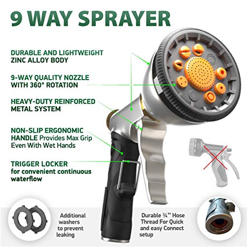 - ๐ All You Need For Quality Watering in 1 Set. We have included in our set: Garden Hose 100 ft, Zinc Alloy Sprayer, 2-Way Splitter, Storage bag, and Hanger. That is all you need! This garden hose is made from a flexible material, making it extremely easy to use and adapt it to your needs. The lightweight material makes it maneuverable and easy to store once youโre done with it.
