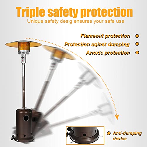 - 【Safety & Stable】The patio heater uses a 20-pound propane tank, which increases the weight of the gas patio heater base and provides much-needed stability and safety in high wind conditions. When the heater is tilted, the device will be automatically turned off to prevent danger.