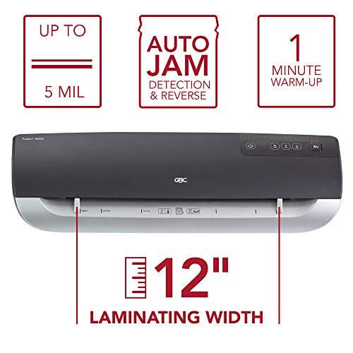 Details: With best in class quality, our laminators will keep up with all of your projects. The GBC Fusion 3000L Laminator is perfect for mid-size offices or any environment with weekly laminating needs. The laminator warms up in just 1 minute for quick and easy use. Laminate up to 17 documents in 10 minutes, with 19" per minute laminating speed. The 12" laminating width allows for a larger variety of projects, while smooth rollers help projects stay wrinkle-free. Compatible with any 3 and 5 mil laminating pouches. Comes with a 3 year warranty and 30 letter size EZUse Premium Speed Pouches, which seal on the longer side to reduce processing time by 22%. Lamination is simple with auto jam detection. Jammed pouches are released at the touch of a button, and auto shut off provides safety and conserves energy. A cold lamination setting provides more laminating options. Cold lamination works with pressure-sensitive adhesive pouches including GBC SelfSeal pouches, sold separately.