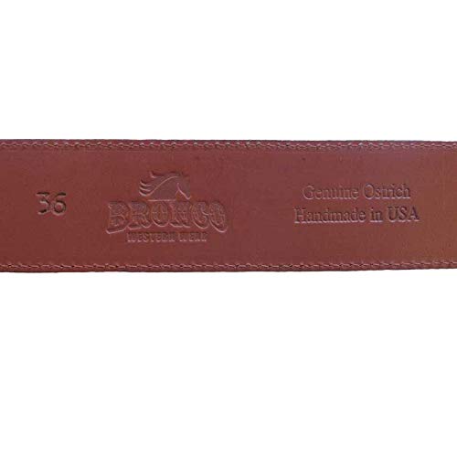Details: Bronco signature handmade genuine premium full quill Ostrich skin belts are ideal for effortlessly transitioning from a formal look with the slacks of your choice, to a casual or western look with your denim pants. This elegant belt can be accessorized to your liking to complement your desired pair of boots or shoes, or to refine any attire of your choice. Elevate your style to the next level with this exquisite Bronco belt. Our elegant looking Bronco Ostrich Skin belts are soft and flexible, while still retaining durability, guaranteeing a worthwhile purchase. We use handpicked finest quality ostrich skins. Ostrich skin is one of the durable leathers within the market, distinguishing itself from other skins. These belts will withstand the test of time, as their naturally produced oils deter cracking and dryness even within extreme temperatures. Furthermore, Bronco belts use soft domestic premium calf leather lining or Italian calf, for an incredible feel around your waist. We use handpicked finest quality Full Quill Ostrich skins. The unique looking bumps known as quills, attribute to the eye-catching texture, and luxurious appearance. Custom made belts are available in any width, Straight and Tapered or any length and also many other colors not mentioned above for a very reasonable price, please send us an email so we can upload an image on Amazon.