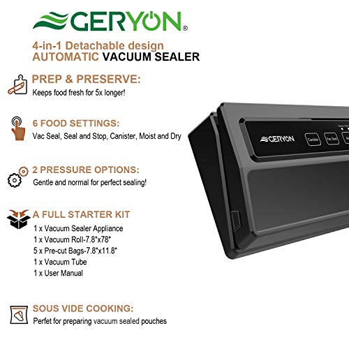 - TWO SEALING MODES: Geryon vacuum food sealer is designed with two selectable modes to provide your food with best possible preservation based on your different types of food. You can also reseal bags of rolls, snacks that you only want to seal