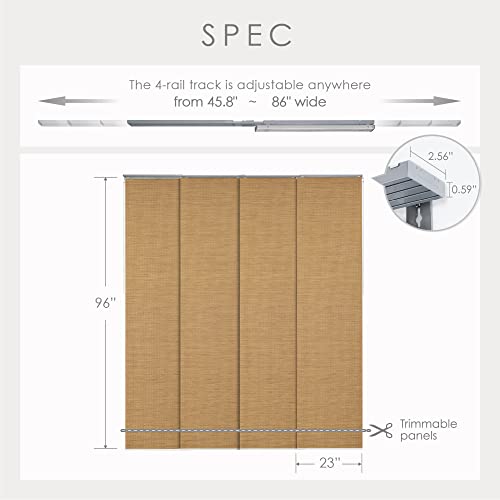 - 【ADJUSTABLE】The cordless 4-rail track is adjustable anywhere from 45.8" to 86" wide. 4 panels included and the dimension of each panel is 23" wide and 96" tall. Panels attached with Velcro and simply trim the panel height to what you need and install the bottom bars for a custom-look finish.