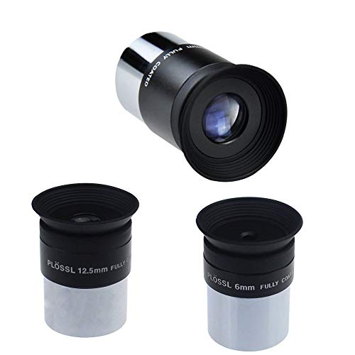 Details: Gosky Telescope 1.25" Plossl Eyepiece 6/12.5/20mm SPL Plossl Eyepiece - 52 Degree FOV and 4-Element Design The super plossl eyepiece gives the widest viewing field along with extra sharpness and long eye relief. It is designed as high quality eyepieces for planetary viewing and daytime observation. It is 4-element plossl design and has a approx 52 degree AFOV. Perfect for broad-field lunar observations, medium-sized star clusters, and a wide range of cloudy nebulas and deep-sky targets. Specifications: Barrel Size: 1.25 inch (31.7mm) Threaded for filters and barlow lens : 1.25" Weight: 5.5oz Package Include: 1 X 6mm Super Plossl Eyepiece 1 X 12.5mm Plossl Eyepiece 1 X 20mm Super Plossl Eyepiece Eyepiece caps