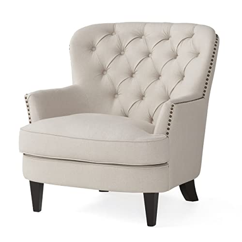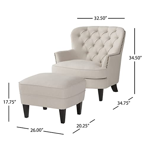 Details: This club chair ottoman set is ideal for any room in your home. With a perfectly designed ottoman to match this club chair, you will be lounging in style. The studded outline of the chair adds the perfect amount of flair to compliment the tufted seat back and plush cushions. Both the club chair and the ottoman have cushions to promote the maximum amount of comfort while in use. This set is great for any room, especially your living room. Includes: One (1) Club Chair and One (1) OttomanMaterial: FabricFabric Composition: 70% Polyester, 21% Acrylic, and 9% LinenLeg Material: Birch WoodColor: NaturalLeg Finish: Matte BlackAssembly RequiredChair Dimensions: 34.75 inches deep x 32.50 inches wide x 34.50 inches highOttoman Dimensions: 20.25 inches deep x 26.00 inches wide x 17.75 inches high.