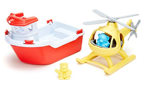 Details: No water rescue is out of reach when the Green Toys rescue boat & helicopter gets the call! This two-in-one toy is just as fun on land as it is in water, with a bright yellow, full-size helicopter nestled on the back deck of the red and white rescue boat. The set also includes two characters – a Captain duck and pilot bear – ready to go wherever your child's imagination takes them. Specially designed to float in the water and open for the dishwasher, this ship is a perfect addition to any bathtub fleet. Made in the USA from 100% recycled plastic with no BPA, phthalates, or PVC. Dishwasher safe. Packaged with recycled and recyclable materials printed with soy inks.