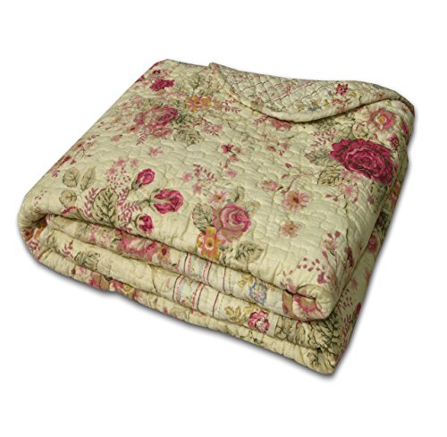 Details: Surface texture and warm colors refine the look of this updated classic quilted throw. The deep ecru fabric features garden roses in rich red and gold hues. Framed and reversed to a coordinating striped fabric. Finely stitched for durability and scalloped along the edges. Measures approximately 50x60".