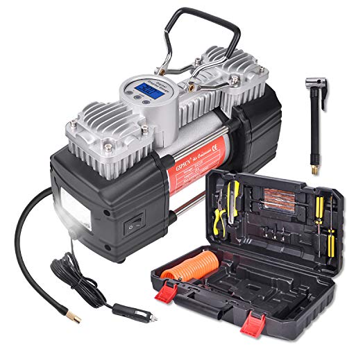 Details: Specifications Power: DC12V, 25A Max pressure: 150PSI Air flow: 70L/min Measurement: 9.4 x 4.4x 7 inches Package Weight: 10.8 lbs Caution 1.If you start the pump, tire pressure quickly rise to 50-100PSI, it is the air blocked, must immediately remove the screw connector and re-operation. 2.If you find any product quality problems, we will promptly answer and solve. Features 1.GSPSCN double cylinder air compressor can quickly inflate your car tires when the tire leaks or tire pressure is insufficient, this pump uses a high-quality direct drive motor to drive the sturdy metal double cylinder, so it is a low rotating speed and high efficiency pump, Powerful power can meet most car tires. 2.The LED light design for easy to use even in the dark and make sure you can be seen in an emergency to avoid any potential dangers. 3..This pump has cigarette lighter with built-in 25A fuse , 11.5ft cigarette lighter power cord, 1.8ft inflation tube, high-quality screw connector can be tightly connected to the tire gas mouth, inflates standard vehicle tire in 2 minutes (200/70/R18, 0-40psi).Considering the tire leaking,we put a tire repair tool in the toolbox. Tire repair kit includes plier,knife,screw,drivers,tyre repair strip,split-eye insertion needle,rasp tool.Other's accessories includes clamp and 3 adapters for bicycles, balls, pool toys, sporting equipment, etc., Package Included: 1 x Portable Air Compressor Pump 3 x Inflatable Adapters 1 x Power Cord With Clamps 1 x Coil Air Hose 1 x User Manual 1x Plier 1x Knife 2x Screw drivers 5x Tyre repair strip 1x Split-eye insertion needle 1x Rasp tool 1x Toolbox 1x Locking air chuck