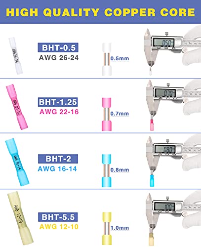- ✔ HIGH QUAILTY COPPER CORE: Core Heat shrink butt connectors use the copper core with high thickness, which is up to 0. 7mm. Make connection project safer! High thickness copper core calls the attention of buyers!