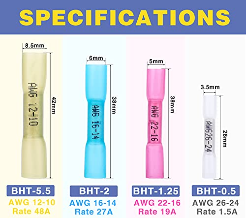 - ✔HIGH QUALITY HEAT SHRINK: Translucent heat shrink tubing provides high tensile strength and resistance to stretch and mechanical damage. Thick barrel ensures strong crimp every time. The inner wall of heat-shrinkable tube has enough hot melt adhesive to ensure waterproof performance. Your wire will never slip out of these heat shrink butt connectors.