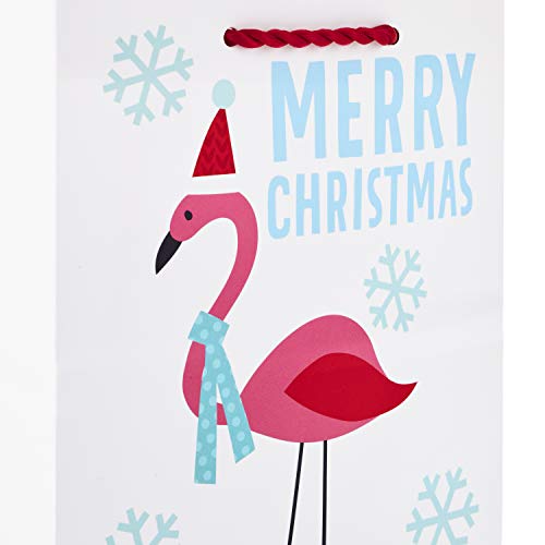 - These Christmas gift bags feature unique and quirky designs: a Yeti with a string of lights on a Red background, flamingo and snowflakes with "Merry Christmas, " waving Santa on light blue, cheery snowman on green.