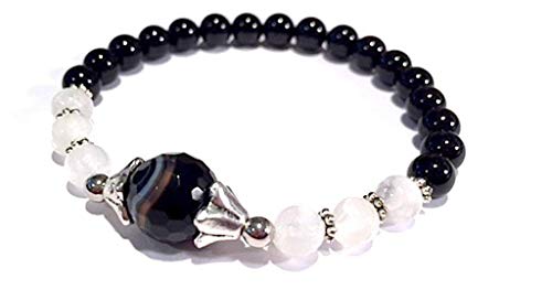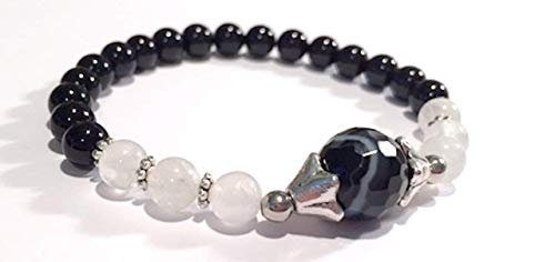 Details: This bracelet is made with a 12mm banded black onyx stone and 6mm moonstone and black tourmaline bead stones. All of these stones are genuine. It is strung on high endurance stretch elastic and measures 7 inches and is quality tested for durability. Beneficial in yoga, meditation, chakra balancing, reiki and energy work. Black Onyx Black onyx can help release negative emotions such as sorrow and grief. Moonstone is said to enhance intuition and lucid dreaming. It balances and calms the emotions, embodies feminine energy and embraces cycles of changes. It promotes psychic development and draws out and heals emotional stress issues. Brings patience, tolerance and sensitivity. (Third eye and crown chakras.) Black Tourmaline is a powerful stone for protection against negative energy of all kinds, as well as being a strong spiritual grounding stone. This stone is a powerful asset to your health, as it not only removes the negative energy but by changing it to positive energy it has an excellent effect on your well being. (each stone is individual and will look a little different)
