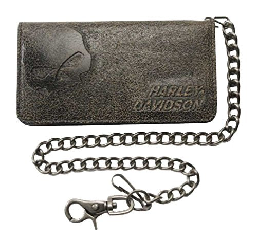 Details: Harley-Davidson Men's Burnished Bi-Fold Willie G Skull Biker Chain Wallet. Made of black and tan distressed genuine leather. Debossed and buffed Willie G Skull logo and H-D script. Has a 19'' antique nickel biker chain with lobster claw clip. Size: 7'' x 3 3/4''.