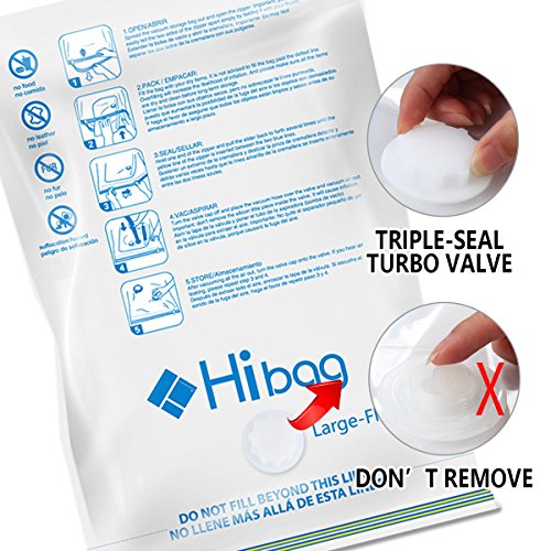 Details: 80% Space Saver Bags: save up to 80% of your storage space! Never worry about suitcase or wardrobe not having enough space! User-friendly Compression Bags: Besides the hand pump included, these vacuum compression bags can be applied to any household vacuum cleaner, make the compression convenient and easy! 1, Please follow our instructions for compression, if you operate properly, we can ensure that the bags will not re-expansion. 2, Our Hibag bags can be applied to any household vacuum cleaner. Double Security Zippered Storage Bags: The space saver storage bags come with a stay-on zip & double-colors zipper, provides DOUBLE SECURITY for air isolation & safe for long term storage. Multi Volume Storage Bags: This space saver bags set comes with 4 different sized vacuum bags, sufficient for most travel and home storage situations. Compression Bags Characteristics: Package Size: 12.60*9.45*1.77 inch; Weight:1.5 bl Material: quality BPA-free PA + PE, passing FDA & Reach certificates, POP & PAH tests Vacuum Compression Bag Thickness: 0.09mm Roll Up Bags Thickness:0.06mm Package included: 2x Small size vacuum compression bags, 15.7” x 23.5” 6x Medium size space saver bags, 19.5” x 27.5” 5x Large size travel compression bags, 21.6” x 33.5” 5x Jumbo size vacuum compression bags, 27.5''X39.35” 2x Jumbo plus size vacuum compression bags, 35.45''X47.25” 2x BONUS roll up travel bags, 15” x 21” 1x BONUS hand pump Lifetime Warranty! If in any case these bags leak, please contact us and we’ll offer you free replacements.